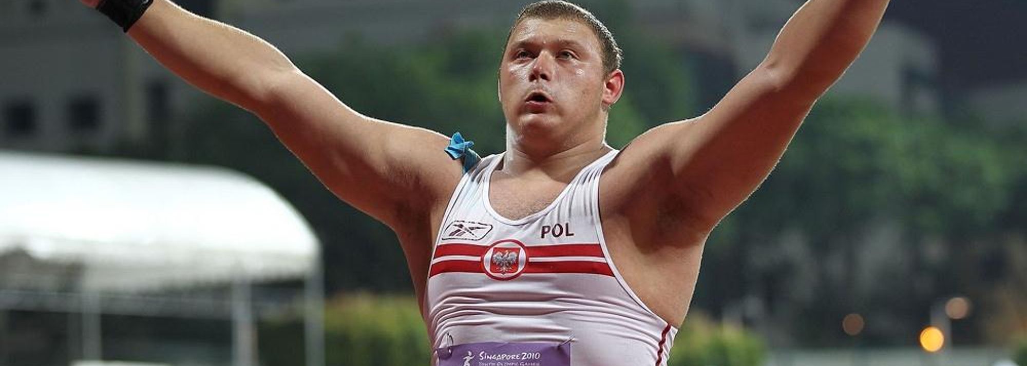 Krzysztof Brzozowski of Poland celebrates winning the boys shot put final at the Youth Olympic Games in Singapore (© XINHUA/ SYOGOC-Pool/ Liao Yujie)