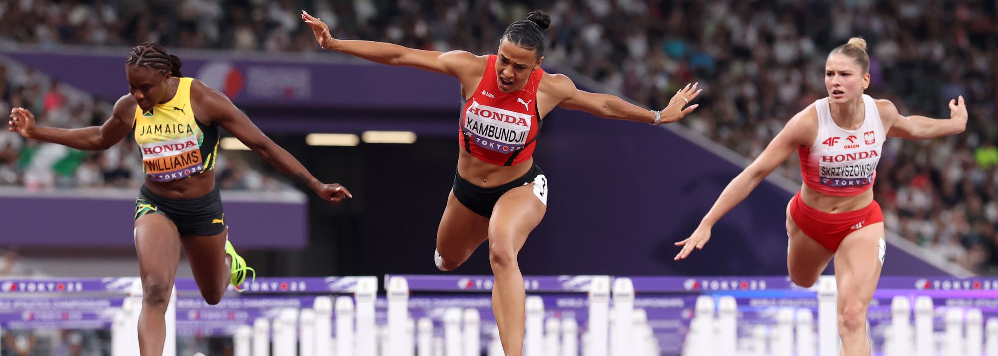 Ditaji Kambundji wins the 100m hurdles at the World Athletics Championships Tokyo 25 (© Getty Images)