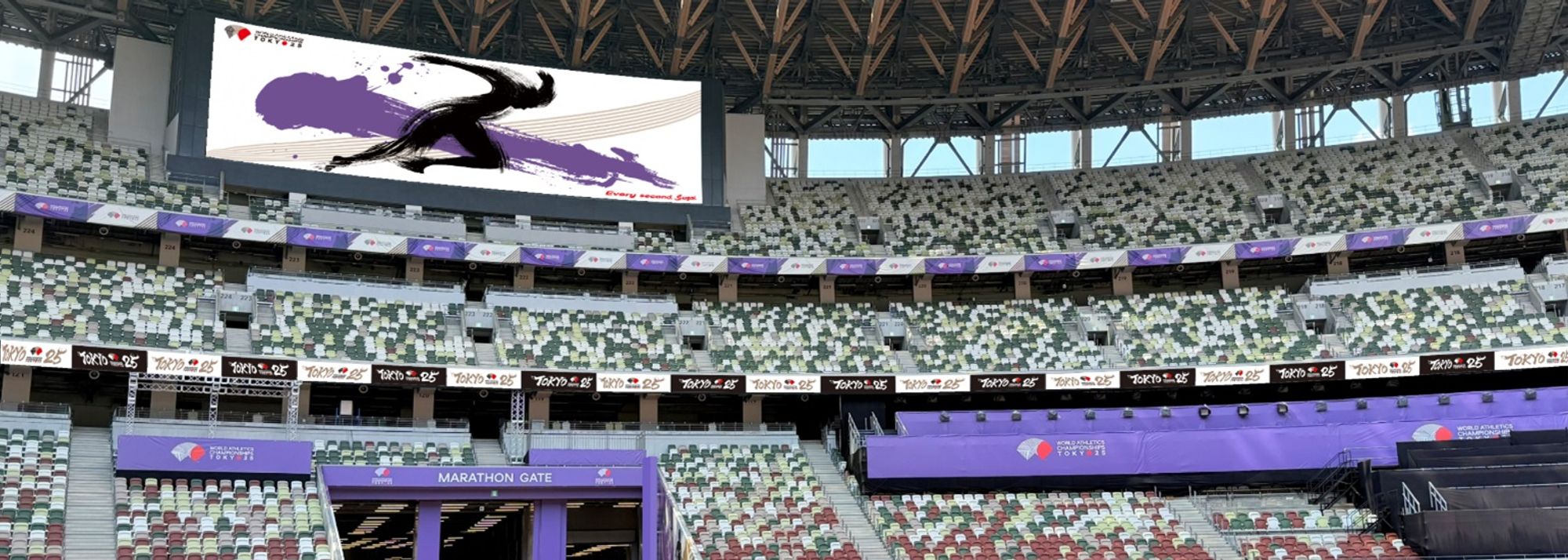 As athletes pass through the stadium tunnels, they enter a journey of anticipation: dynamic competition motifs intertwined with the fluid energy of calligraphy brushstrokes. More than decoration, these elements steady nerves, lift spirits, and propel athletes toward the light of the world stage. At the heart of this vision is Edo purple, the championships’ signature colour. Deep and dignified, it embodies both serenity and prestige, transforming the stadium into a stage worthy of the world’s finest athletes.