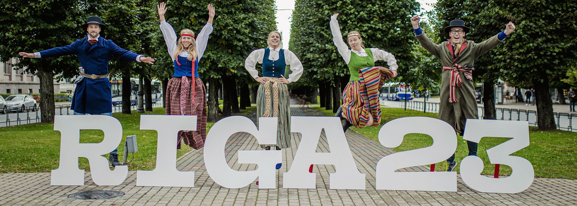 Dressed in Latvian national folk costumes, the organisers will present Riga with giant letters “RIGA 23” in both Copenhagen and Berlin. Mini-versions of the letters can be seen in a symbolic photo on Brīvības Street in Riga before leaving.