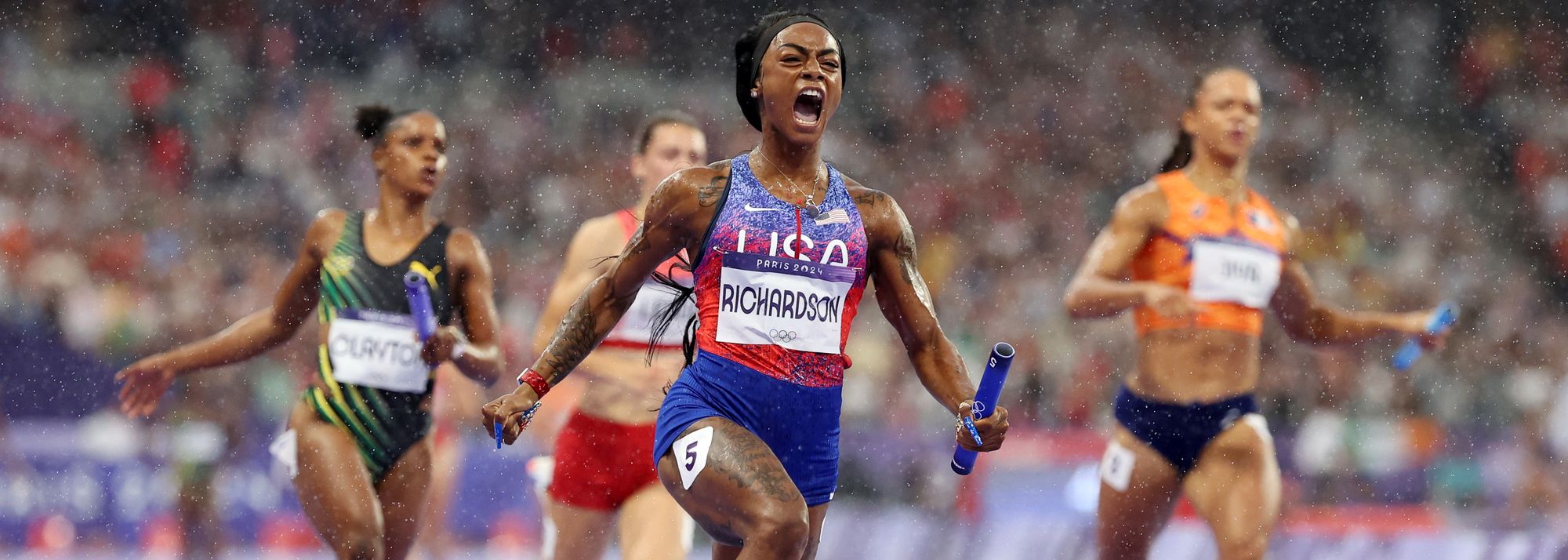 It was the third gold medal claimed by the US women in the event in the past four Olympics, joining victories in London and Rio de Janeiro, though at first Great Britain was shown as the winner on the scoreboard above Stade de France. Richardson looked at the finish order in apparent confusion before the result was quickly corrected.