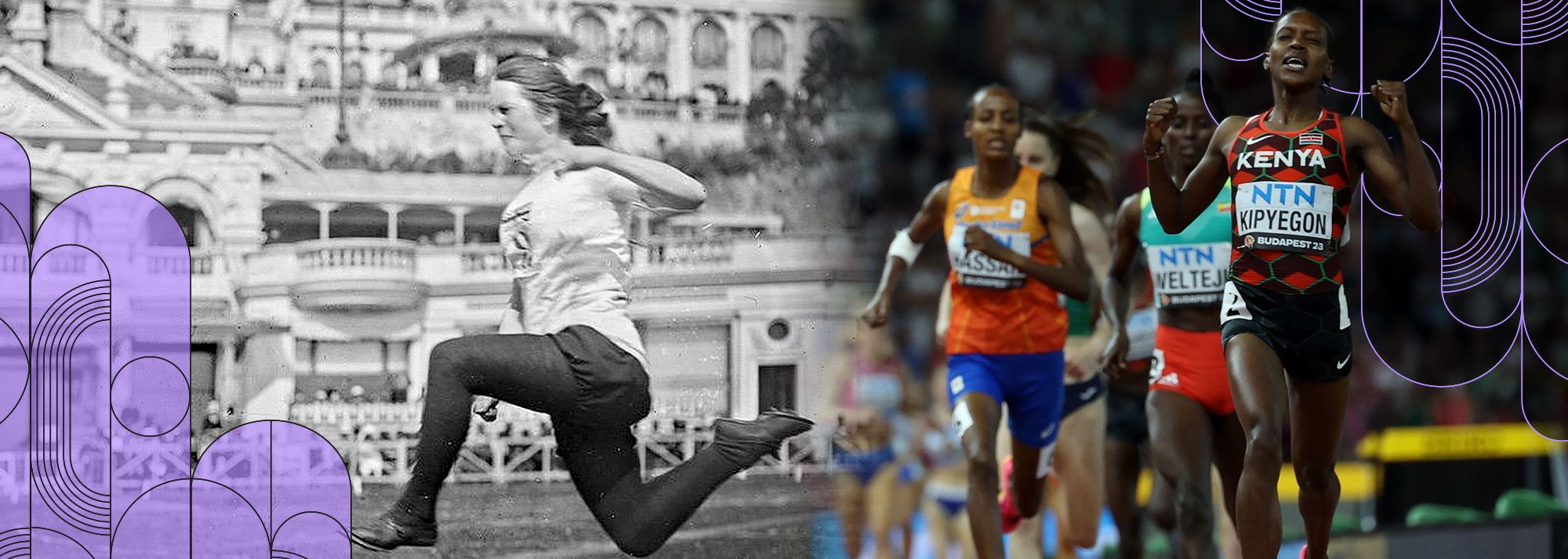1924 to 2024: the inaugural Women's Games (left), and Faith Kipyegon winning the 2023 world title