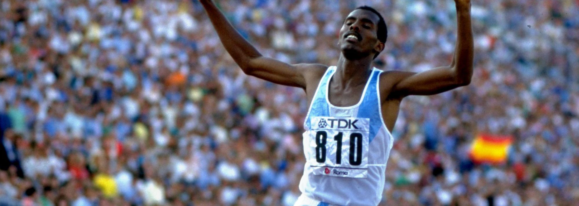 Abdi Bile celebrates his 1500m win at the 1987 World Championships in Rome (© Allsport / Getty Images)