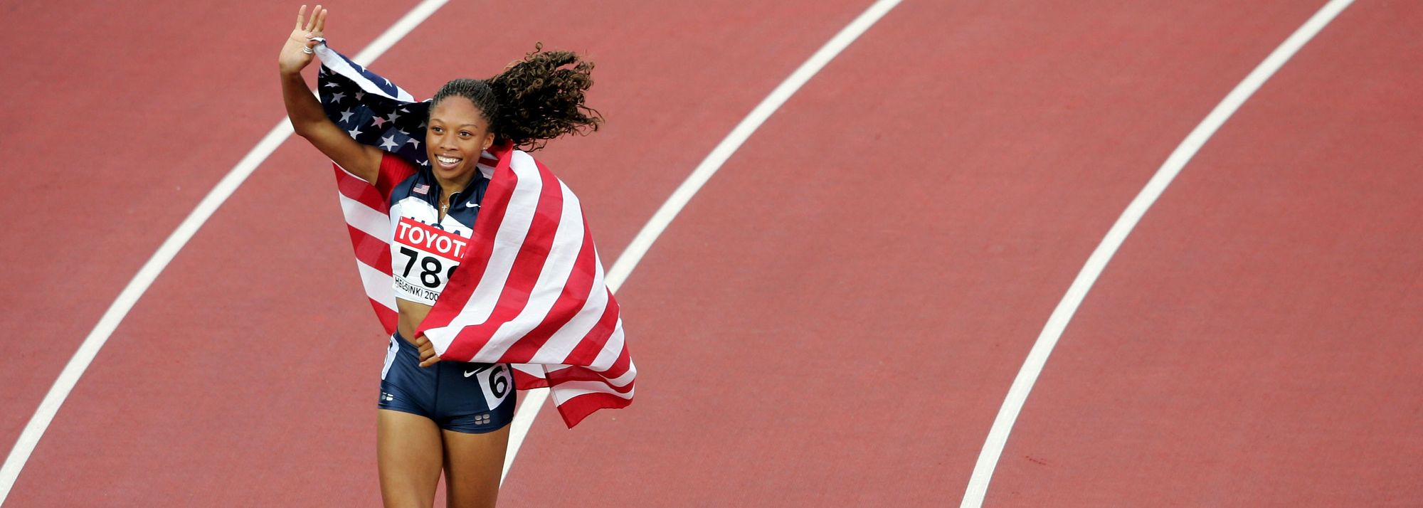 Allyson Felix after winning the 200m at the 2005 World Championships in Helsinki (© Getty Images)