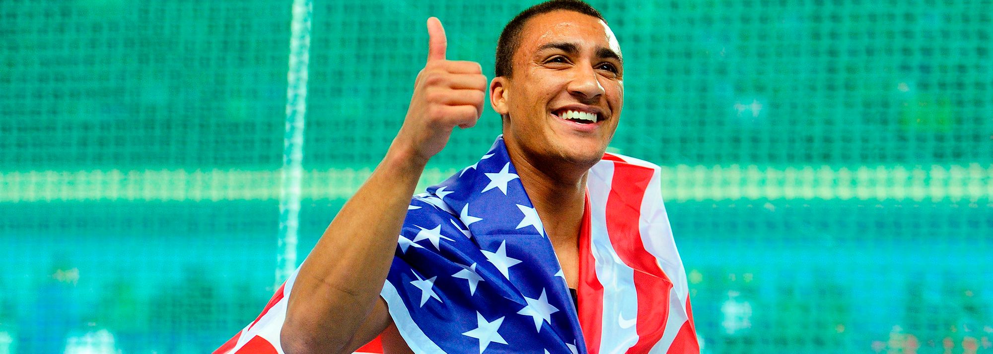 Ashton Eaton celebrates his world heptathlon record at the 2012 World Indoor Championships in Istanbul (© AFP / Getty Images)