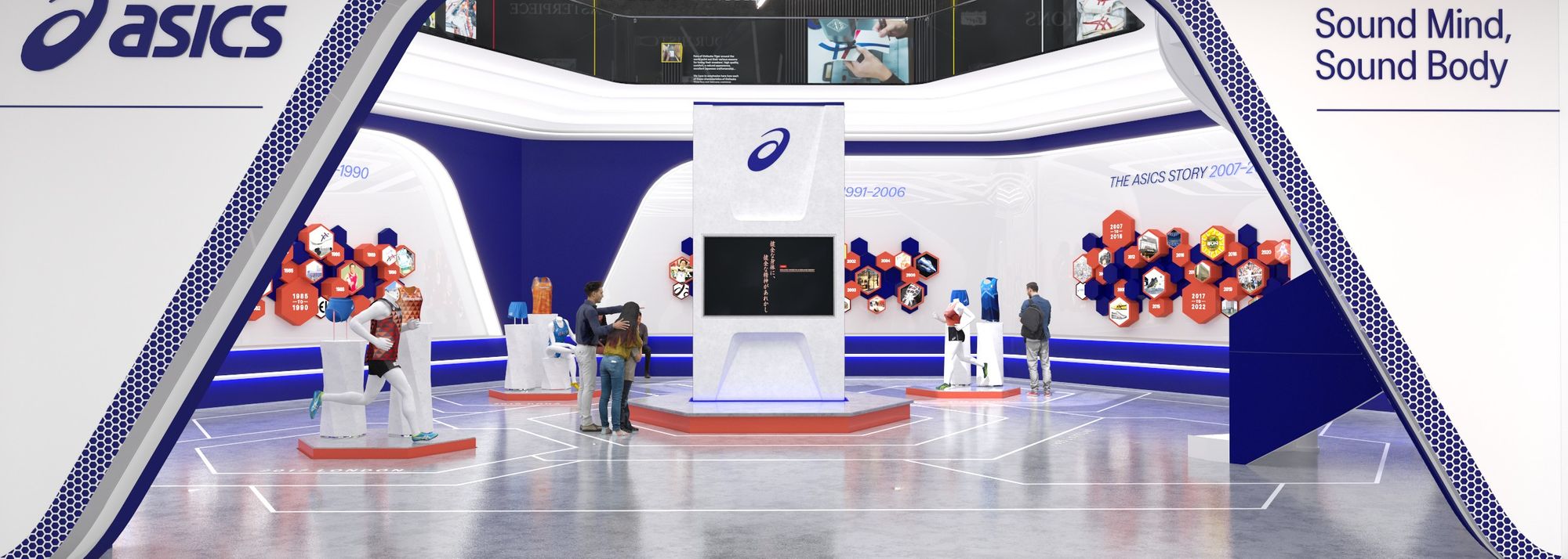 Visitors enter the new room through an ASICS arch branded with the tagline ‘Sound Mind, Sound Body’. This is the philosophy adopted by company founder Kihachiro Onitsuka and from which ASICS’ name, an acronym, is derived. The Latin phrase “Anima Sana In Corpore Sano” translates to “a sound mind in a sound body.”