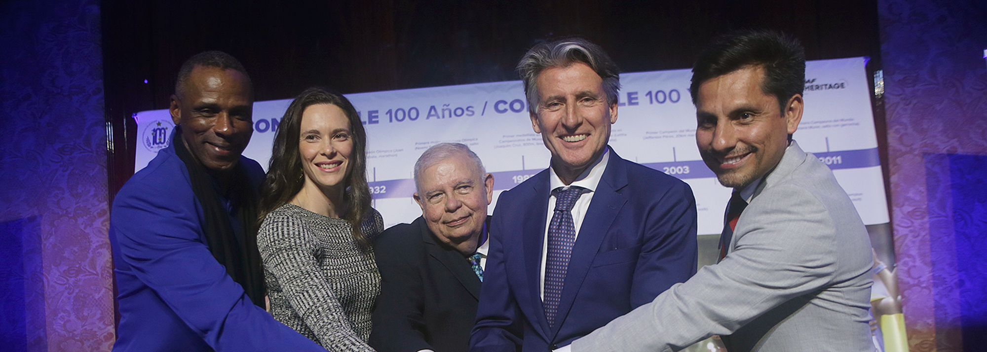 Robson Da Silva, Fabiana Murer, Roberto Gesta De Melo, Sebastian Coe and Jefferson Perez at ConSudAtle's centenary (© IAAF)