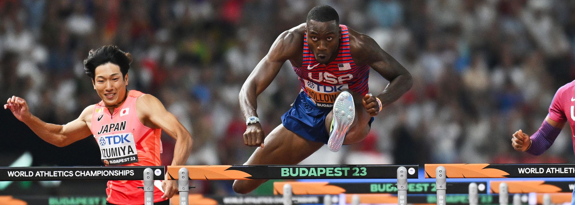 Grant Holloway wins the 110m hurdles at the World Athletics Championships Budapest 23 (© Getty Images)