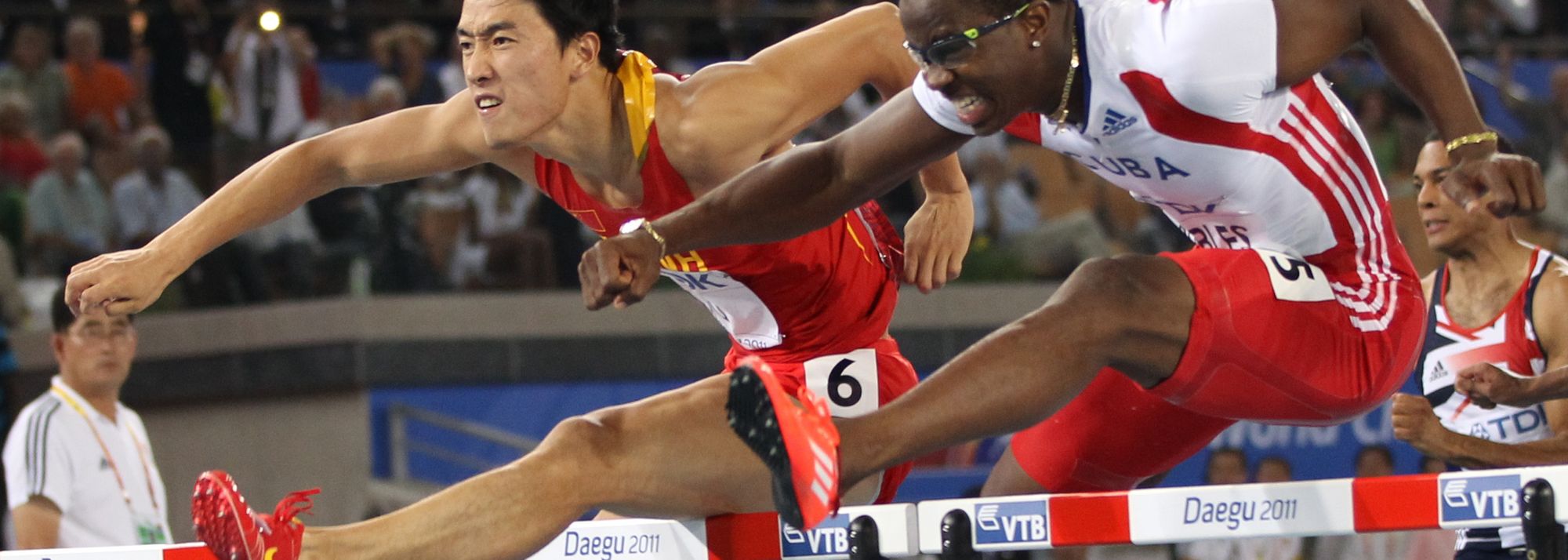 Liu Xiang and Dayron Robles in the 110m hurdles final in Daegu (© AFP / Getty Images)