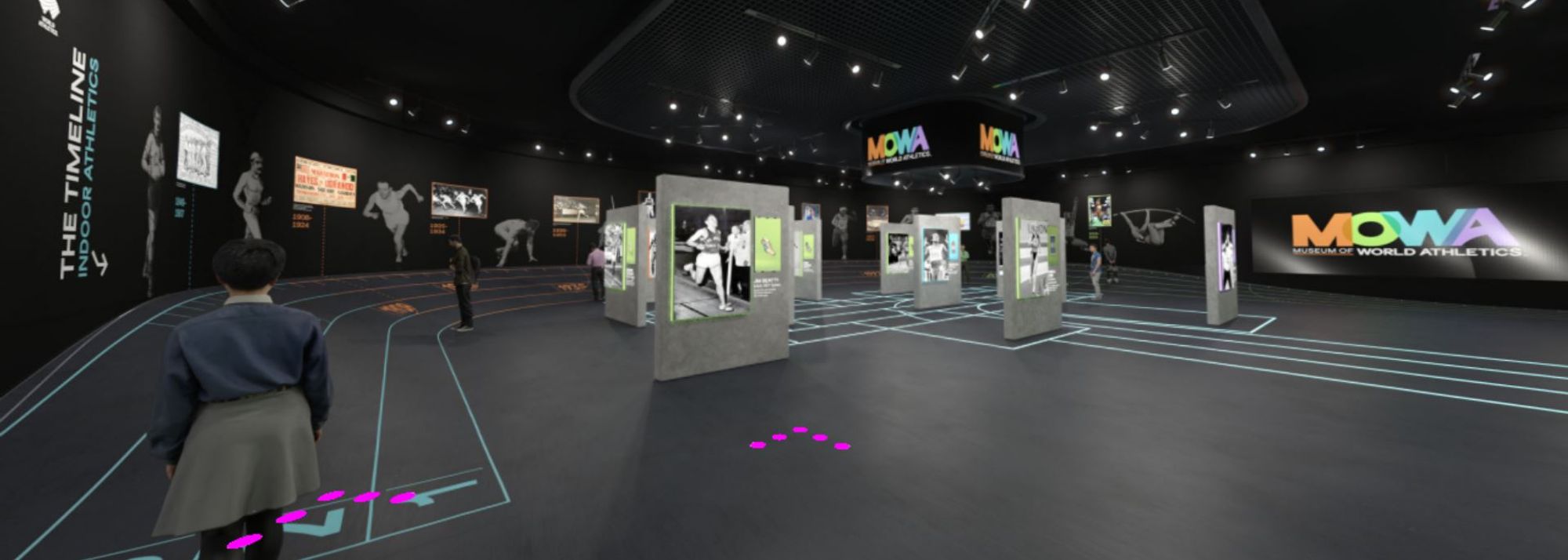 La nouvelle galerie du MOWA, le premier musée au monde entièrement virtuel dédié au sport, a été créée autour de deux axes. Une moitié de la salle évoque la dimension théâtrale d’une arène d’athlétisme en salle. L’autre moitié fait s’ouvrir le toit du MOWA pour laisser place à l’athlétisme en plein air, en reprenant les éléments naturels qui reflètent la diversité des chemins de cross-country et les parcours goudronnés des épreuves d’athlétisme sur route.
