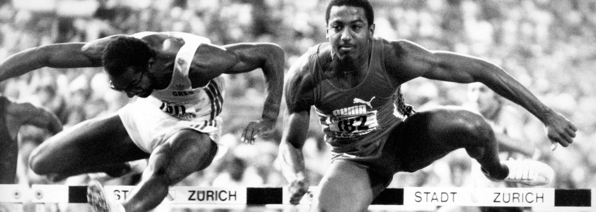Renaldo Nehemiah on his way to a sub-13-second time in the 110m hurdles in Zurich (© IMAGO)