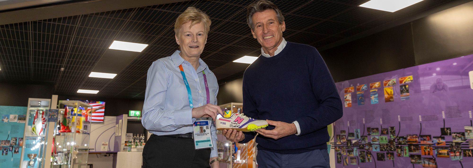 Yvonne Murray-Mooney donates her 1993 spikes to World Athletics President Sebastian Coe for the MOWA (© MOWA)