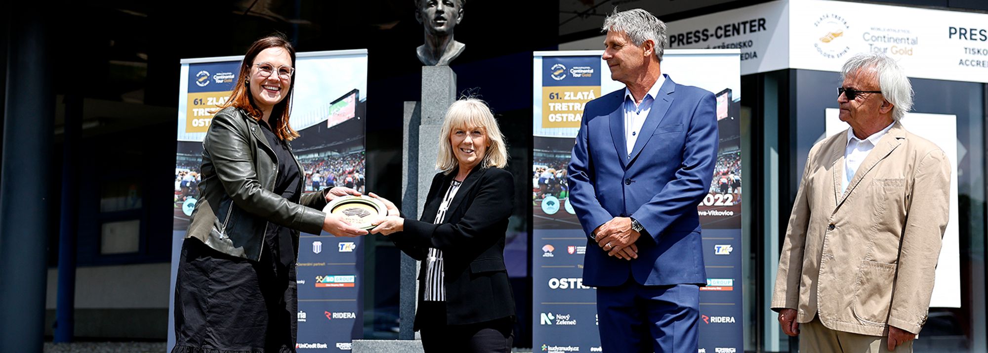 On the eve of the 61st edition of the Golden Spike, European Athletics vice president Cherry Alexander, on behalf of World Athletics, presented the plaque to meeting director Jan Zelezny, the three-time Olympic and world javelin champion. They were joined by Andrea Hoffmannova, the deputy mayor of the city of Ostrava, and Oldrich Zvolanek of SSK Vitkovice.