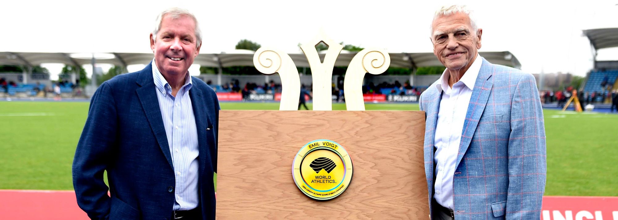 At a ceremony held on the track at the Manchester International at Manchester Regional Arena, Sir Brendan Foster CBE, and prolific novelist Peter Lovesey, presented the plaque which was originally awarded to Voigt by World Athletics President Sebastian Coe in December 2019.