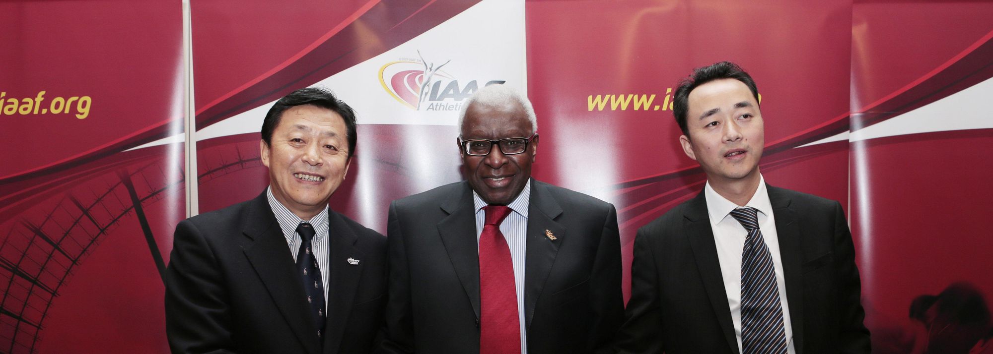 Guiyang delegation (Vice-Mayor Gao Weidong and Chinese Athletics Association General Secretary Du Zhaocai) - 2015 IAAF World Cross Country Championships hosts - with President Diack in Barcelona (© IAAF)
