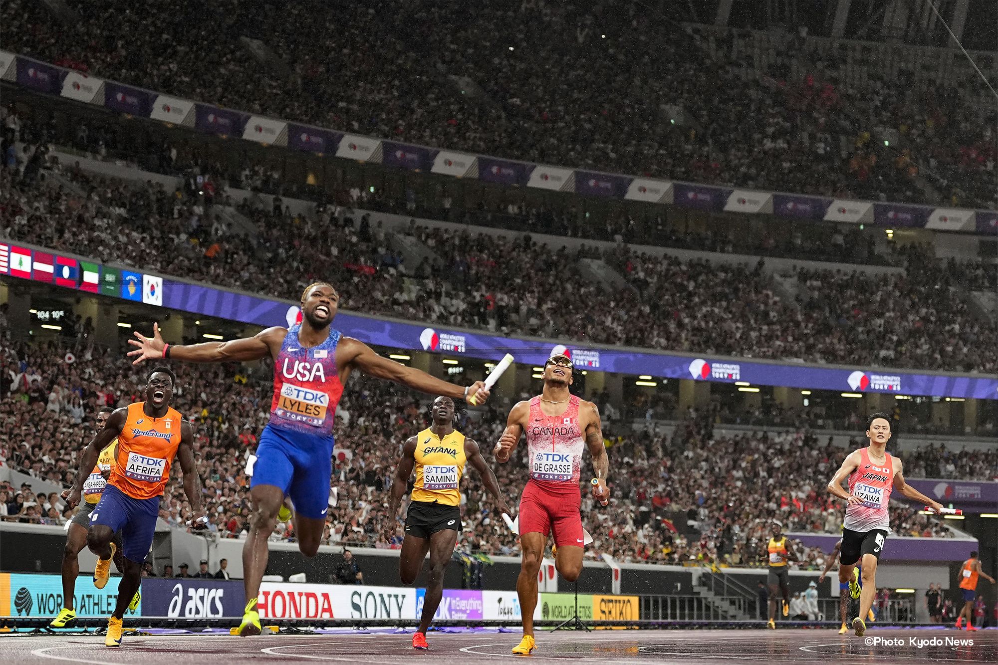 小池が強豪国に食らいつき、栁田は世界のエースたちと渡り合う。桐生はふくらはぎにケイレンを起こしながらも踏ん張り、鵜澤は日本のアンカーとしての力を示した。優勝争いは、アンカーに200m4連覇のノア・ライルズを起用したアメリカが37秒29で制し、2連覇を達成。37秒55でカナダが2位、自国新の37秒81でオランダが3位に入った。日本は、38秒35で6位――。