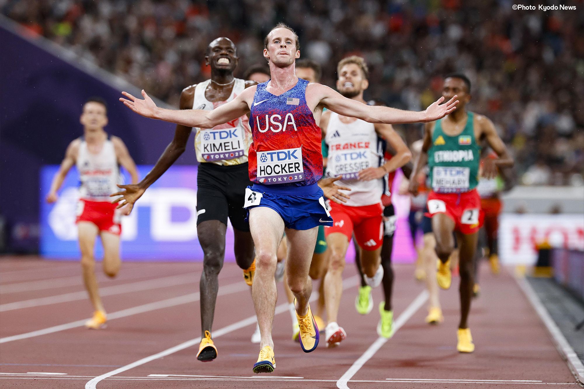 続く男子5000mは、3600mを過ぎて3連覇が懸かるヤコブ・インゲブリクトセン(ノルウェー)がトップに立ってレースを動かす。大集団のまま、残り1周のスパート勝負へ。ビニアム・メハリ(エチオピア)、イザック・キメリ(ベルギー)と目まぐるしくトップが入れ替わる。そして、勝負を決めたのがコール・ホッカー(アメリカ)の目の覚めるようなラストスパート。最後の直線で一気に抜け出し、12分58秒30でアメリカ勢として2007年大阪大会(バーナード・ラガト)以来28年ぶりの栄冠をもぎ取った。キメリが12分58秒78で2位、10000m王者のジミー・グレシエ(フランス)が12分59秒33で3位と2つ目のメダルを手にした。インゲブリグトセンは10位にとどまった。