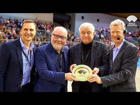Jon Ridgeon presents World Athletics Heritage Plaque to Indoor Meeting Karlsruhe