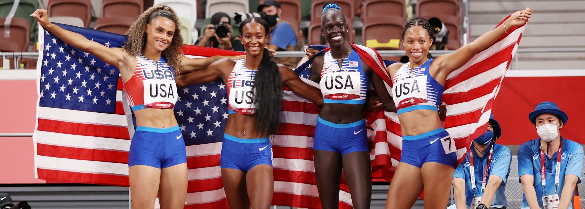 Sydney McLaughlin, Dalilah Muhammad, Athing Mu and Allyson Felix after their Olympic 4x400m win in Tokyo (© Getty Images)