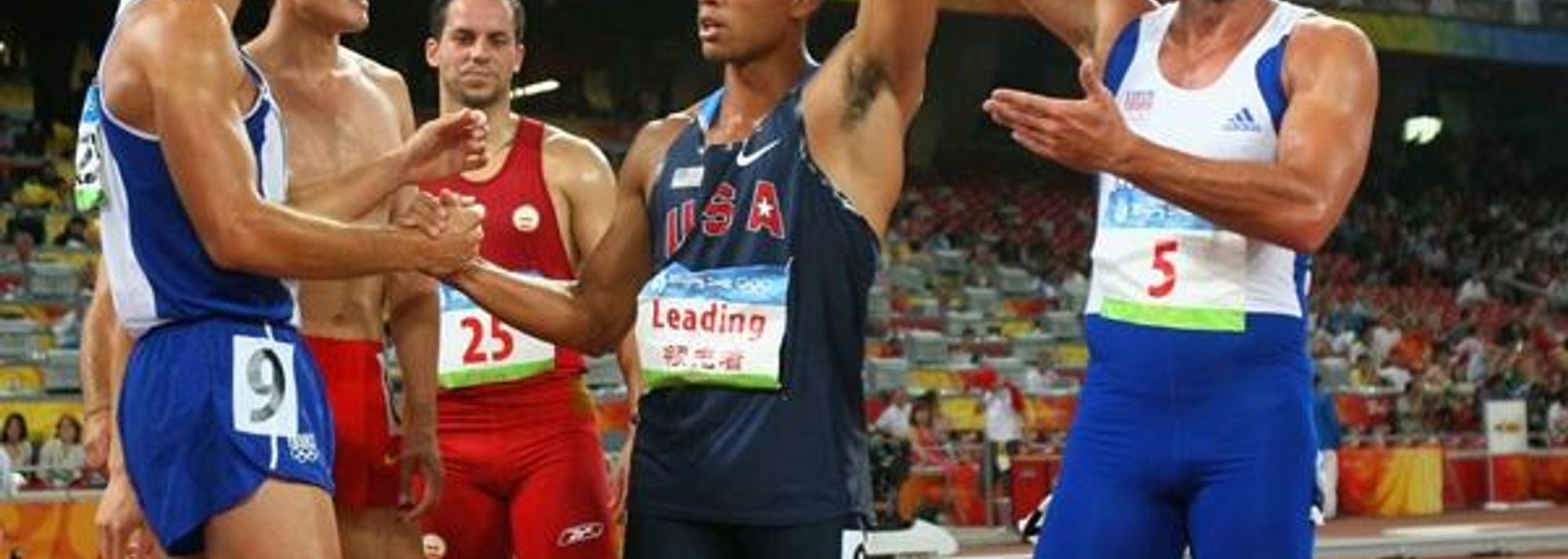 The changing of the guard: 2004 Olympic decathlon champion Roman Sebrle salutes the new champion, Bryan Clay (© Getty Images)