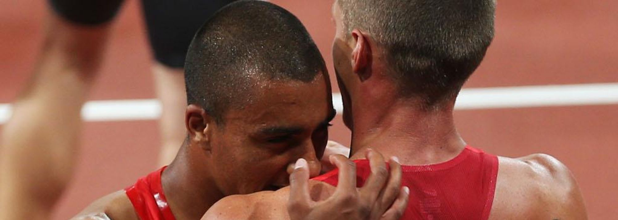 Ashton Eaton (L) of the United States hugs Trey Hardee (R) of the United States after winning gold and silver in the Men's Decathlon event of the London 2012 Olympic Games on 9 August 2012 (© Getty Images)