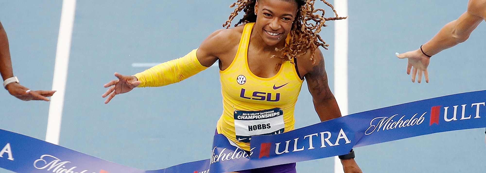 In her final year competing for Louisiana State University – the powerhouse programme overseen by coach Dennis Shaver – Hobbs won the 60m title at the NCAA Indoor Championships in Texas before blazing to victory on a rain-soaked track in Oregon to take the NCAA outdoor 100m title in 10.91.