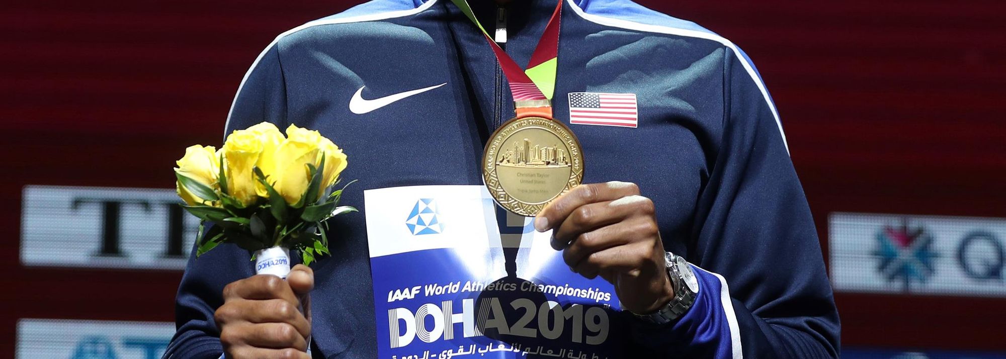 Christian Taylor with his triple jump gold medal at the IAAF World Athletics Championships Doha 2019 (© AFP / Getty Images)