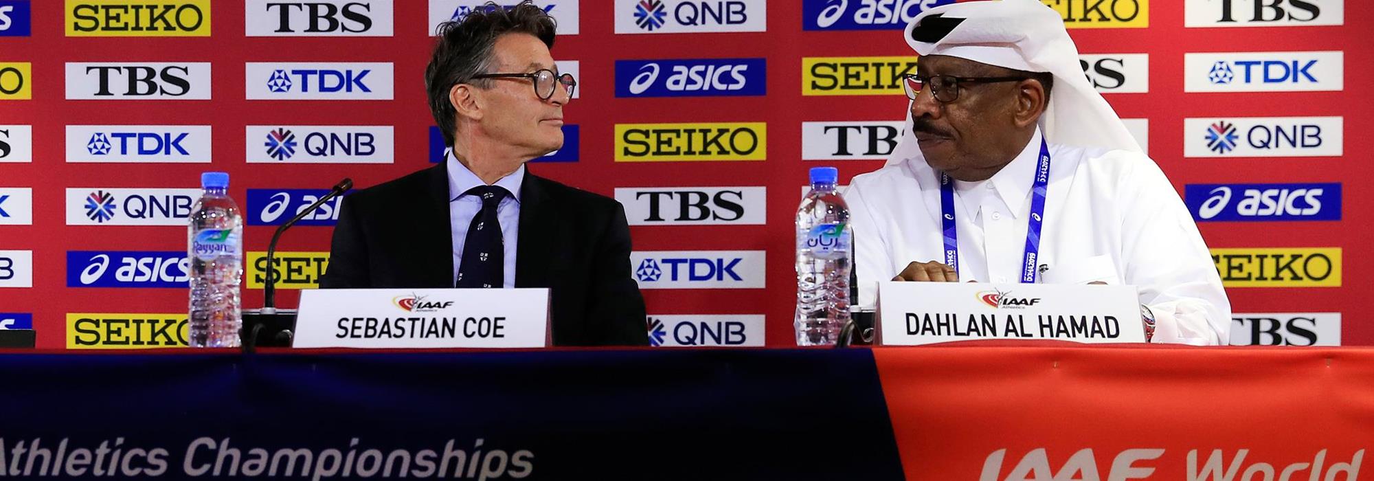 IAAF President Sebastian Coe and Local Organising Committee Vice President Dahlan Al-Hamad shared the stage to formally welcome the world to the Qatari capital on the eve of the IAAF World Athletics Championships Doha 2019 at the official IAAF/LOC Press Conference at Khalifa Stadium on Thursday (26).