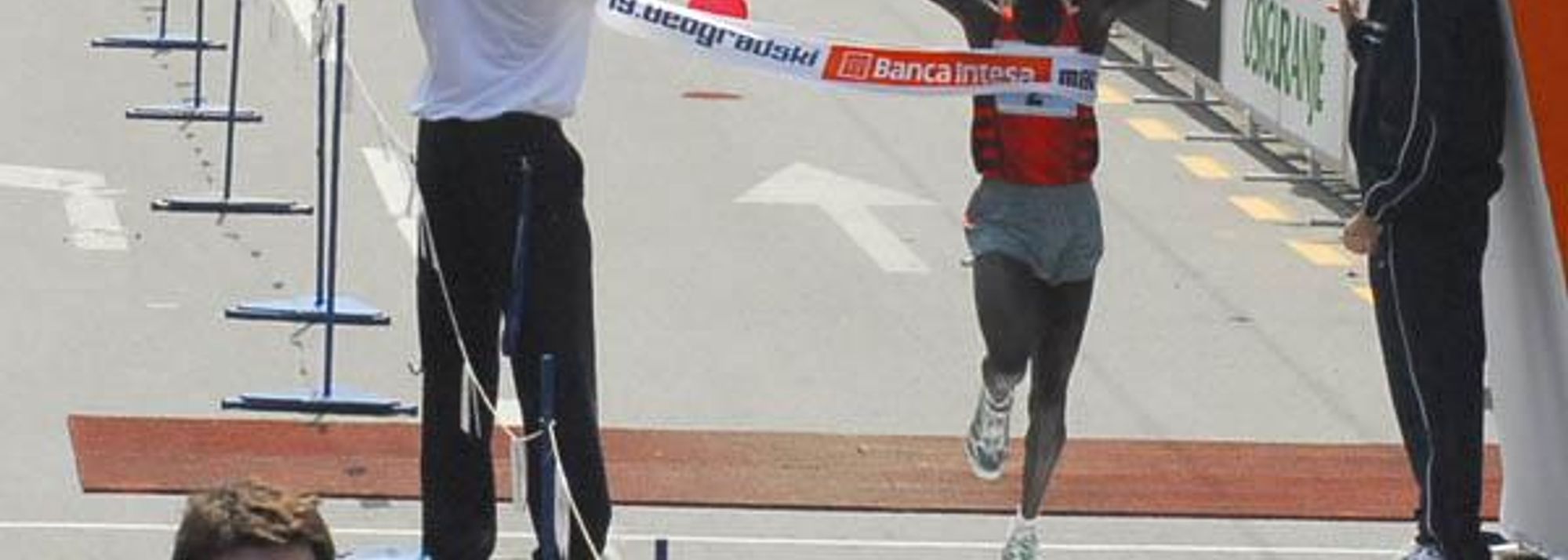 Japhet Kosgei crosses the line in 2:10:54, a course record in Belgrade (© Pedja Djurovic)