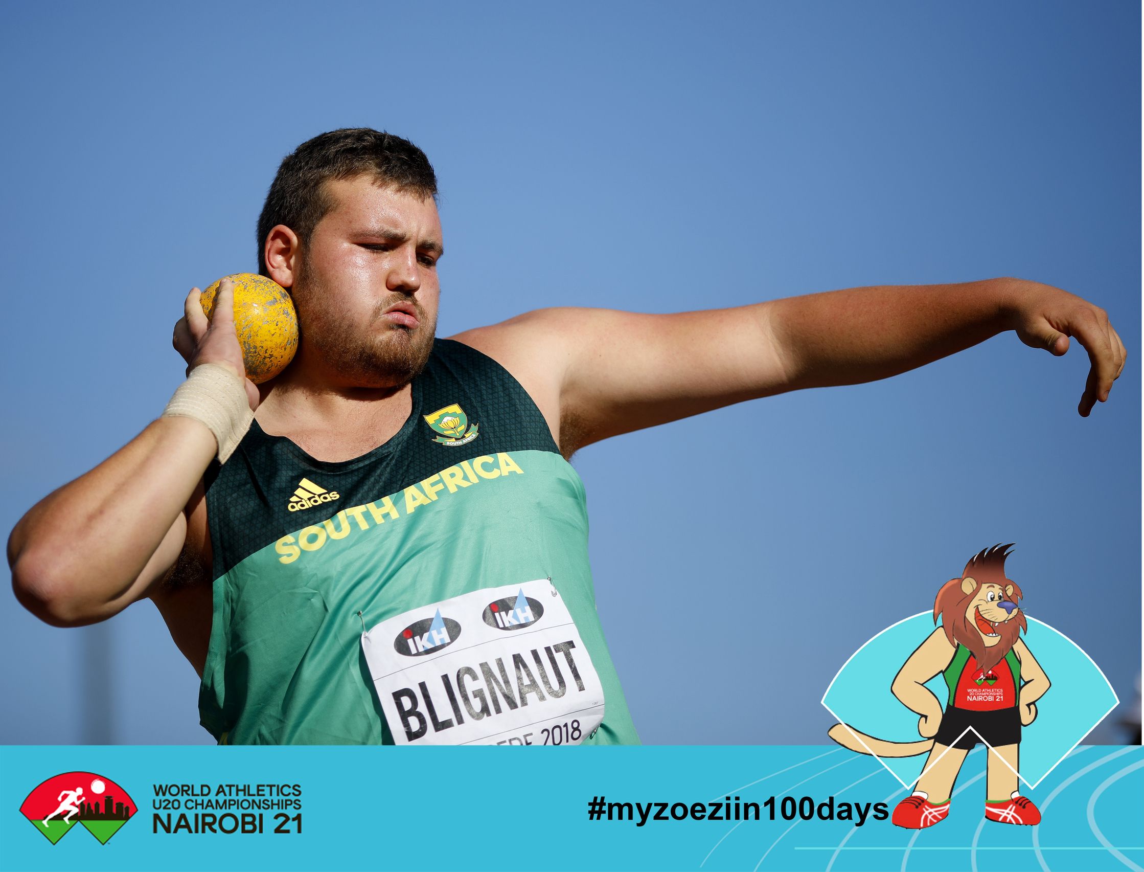 Kayle "Kyle" Blignaut (born November 9, 1999) is a shot put specialist from South Africa. At the 2018 IAAF World U20 Championships in Tampere, Blignaut won gold. In 2018, while representing Monument High at a schools track and field event in Potchefstroom, he broke the national junior mark of 20.50m held by Janus Robberts for nearly 20 years with a 20.66m heave with the 6kg junior shot. Later that season, he showed his true potential by winning the Southern Region U-20 Championships in Boksburg with a 21.65m leap. He won the gold medal at the world junior event in Finland less than three months later, throwing 22.07m in the fifth round, beating out American opponent Adrian Piperi by one centimetre.