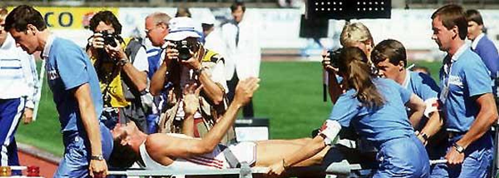 Successfully qualifying for the semi-final stage by finishing in second place in his preliminary round heat on Sunday 7 August 1983, Juantorena having crossed the finish-line in Helsinki’s Olympic stadium caught a foot on the curb of the track and twisted his ankle severely. Triumph turned instantly to tragedy as he left the track in agony, carried out on a stretcher. A great career had entered and exited its World Championship stage in just one race, as his injury prevented his start in the semi-final.