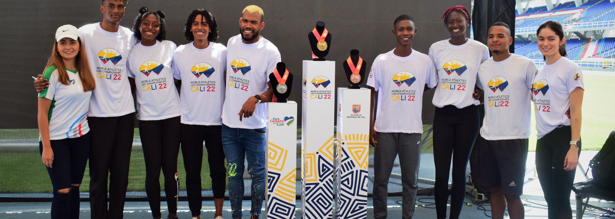 With joy and panache, Anthony Zambrano and event mascot Calidoso took to the athletics track of the Pascual Guerrero Olympic Stadium, where Zambrano was named ambassador of the event and the medals for the World Athletics U20 Championships Cali 22 were unveiled.