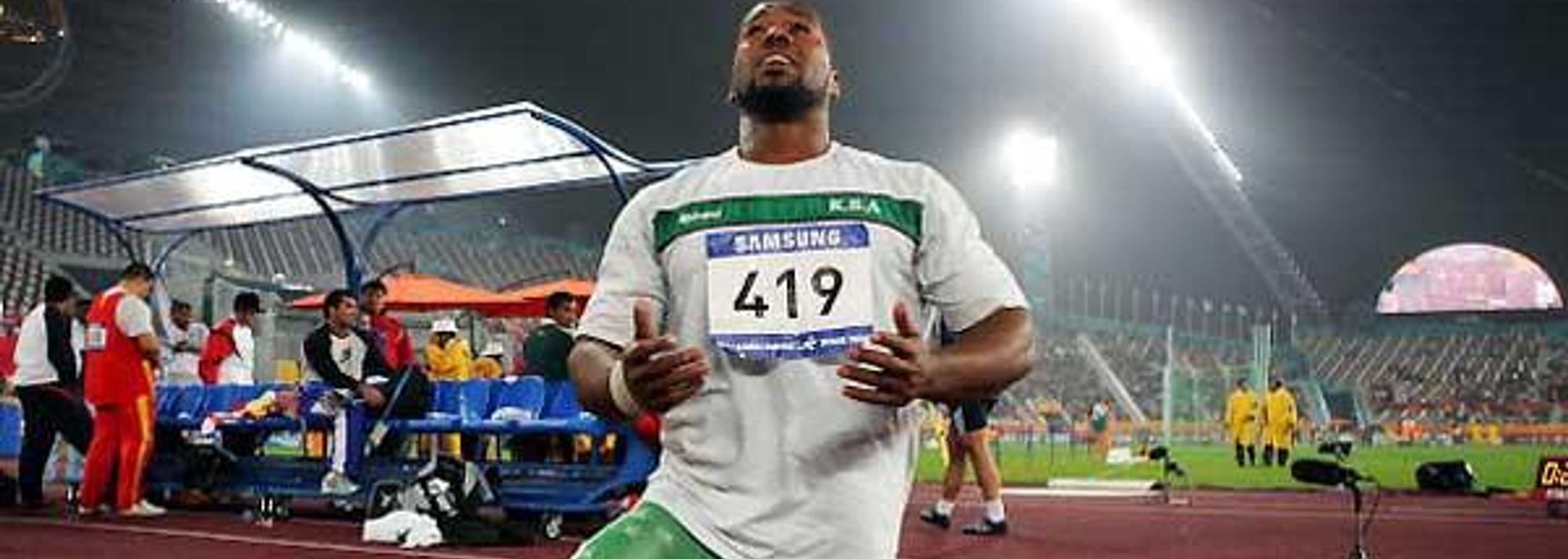 In the men's Shot Put, Athens Olympic gold medallist Yuriy Bilonoh came second with 20.20m, beaten by Sultan Mubarak Al-Hebshi from the Kingdom of Saudi Arabia. The 22-year-old Asian Games champion won with a release of 20.61m which is an Asian record. The previous best was 20.54m set in 2005 by Kuwaiti Khalid Habash Al-Suwaidi.