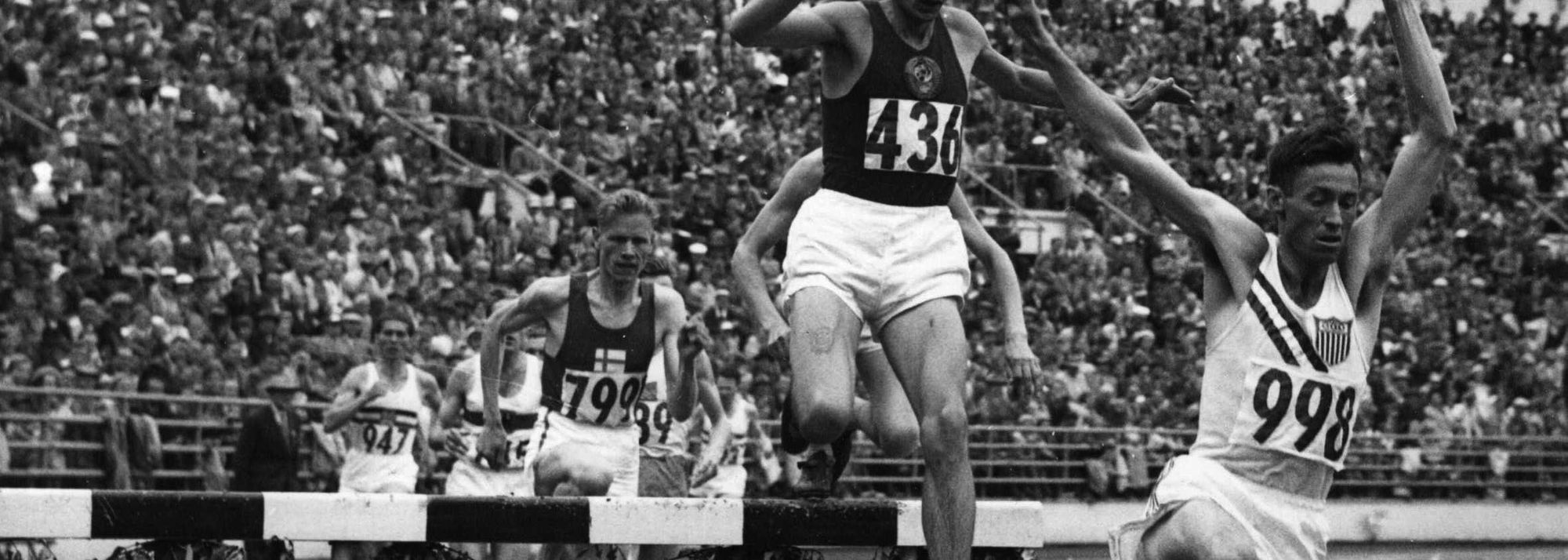 Horace Ashenfelter (r) leading Vladimir Kazantsev in the steeplechase at the 1952 Olympic Games (© Getty Images)