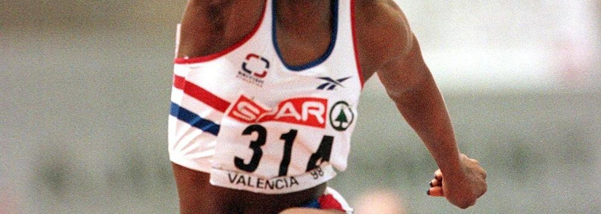 Ashia Hansen in action in the triple jump at the 1998 European Indoor Championships in Valencia (© Getty Images)