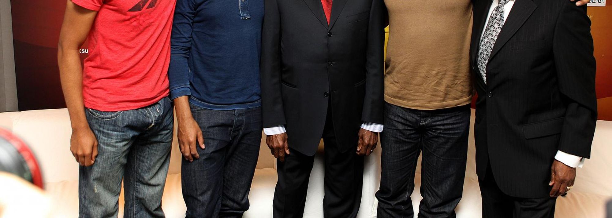 Historical hurdling gathering, from left: Aries Merritt, Colin Jackson, IAAF President Lamine Diack, Renaldo Nehemiah and Harrison Dillard (© Giancarlo Colombo)