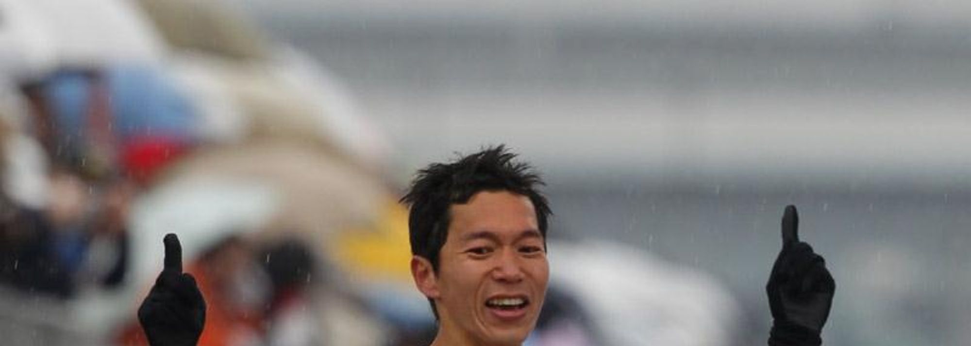 Running in wind, rain and finally snow, Masakazu Fujiwara prevails at the 2010 Tokyo Marathon (© Kazuo TANAKA/Agence SHOT)