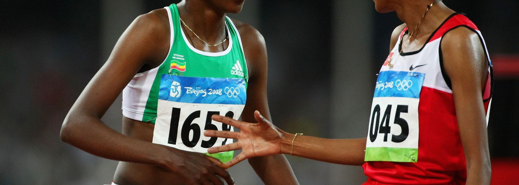 Elvan Abeylegesse (r) congratulates Tirunesh Dibaba in Beijing (© Getty Images)