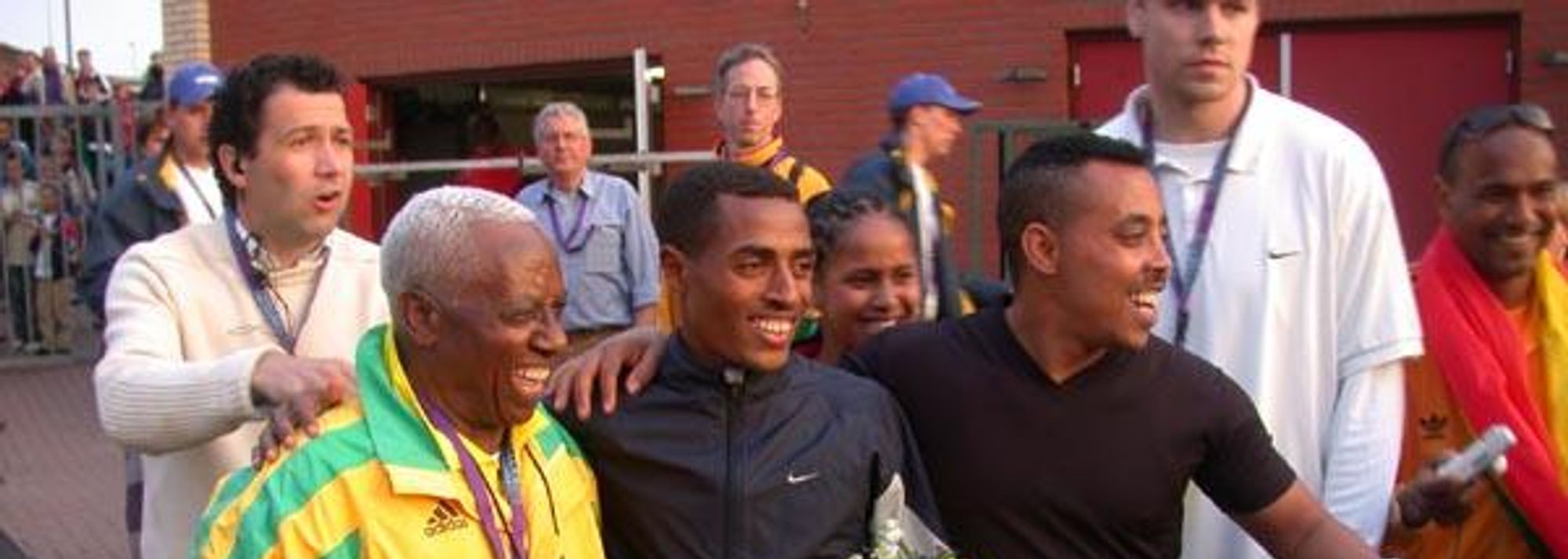 Kenenisa Bekele (ETH) celebrates breaking the 5000m World record in Hengelo (© Willem Pfeiffer)