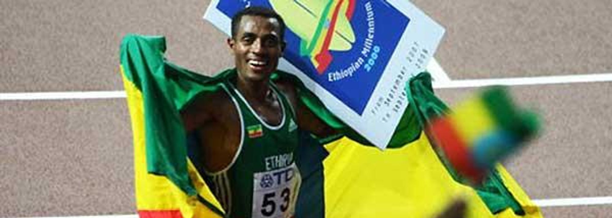 Bekele with a banner displaying the celebration of the Ethiopian Millennium 2000 - based upon their unique calendar - acknowledges his fans in Osaka (© Getty Images)