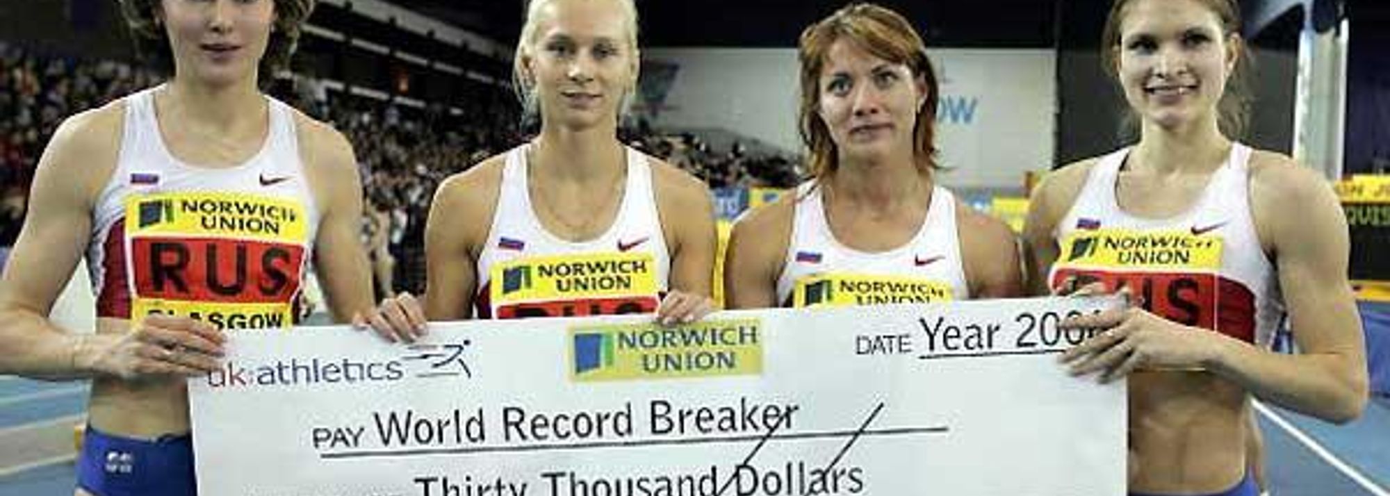 The Russian quartet of Yuliya Gushchina, Olga Kotlyarova, Olga Zaytseva and Olesya Krasnomovets took more than half a second from the record set by Russia at the World Indoor Championships in Budapest two years ago, clocking 3:23.37 in a commanding performance that was rewarded with $30,000 from the organisers.