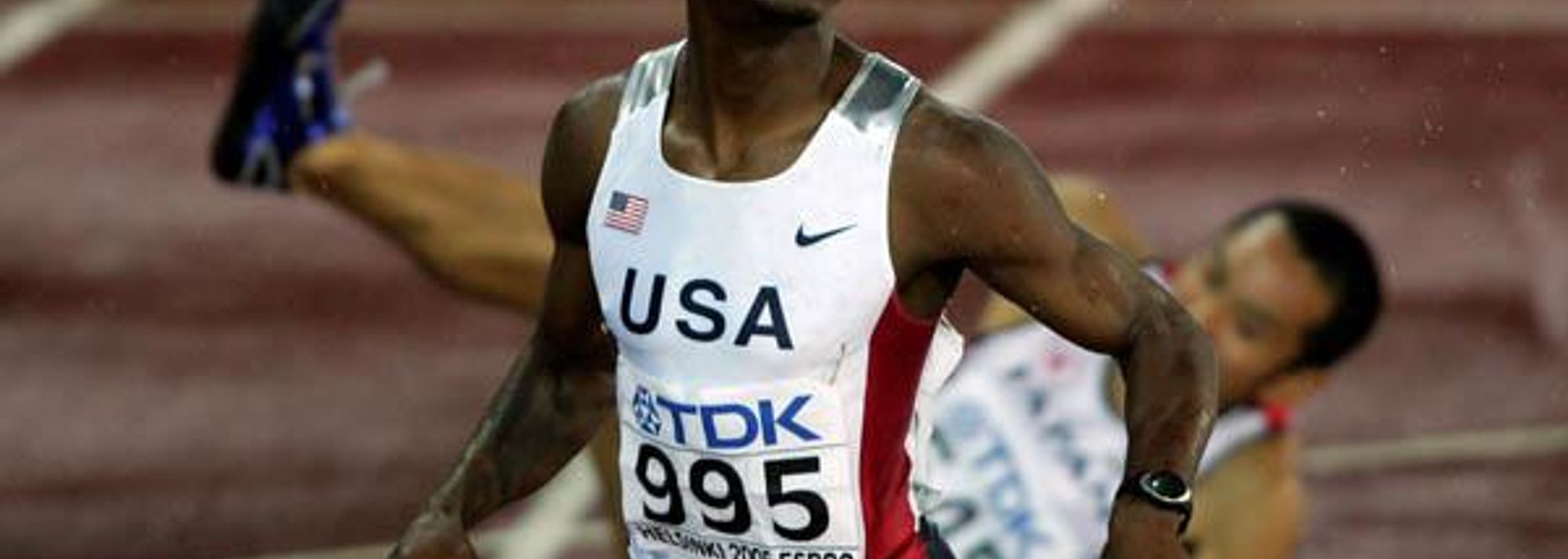 Splashing through a downpour, Bershawn Jackson of the takes the 2005 400m Hurdles gold medal (© Getty Images)