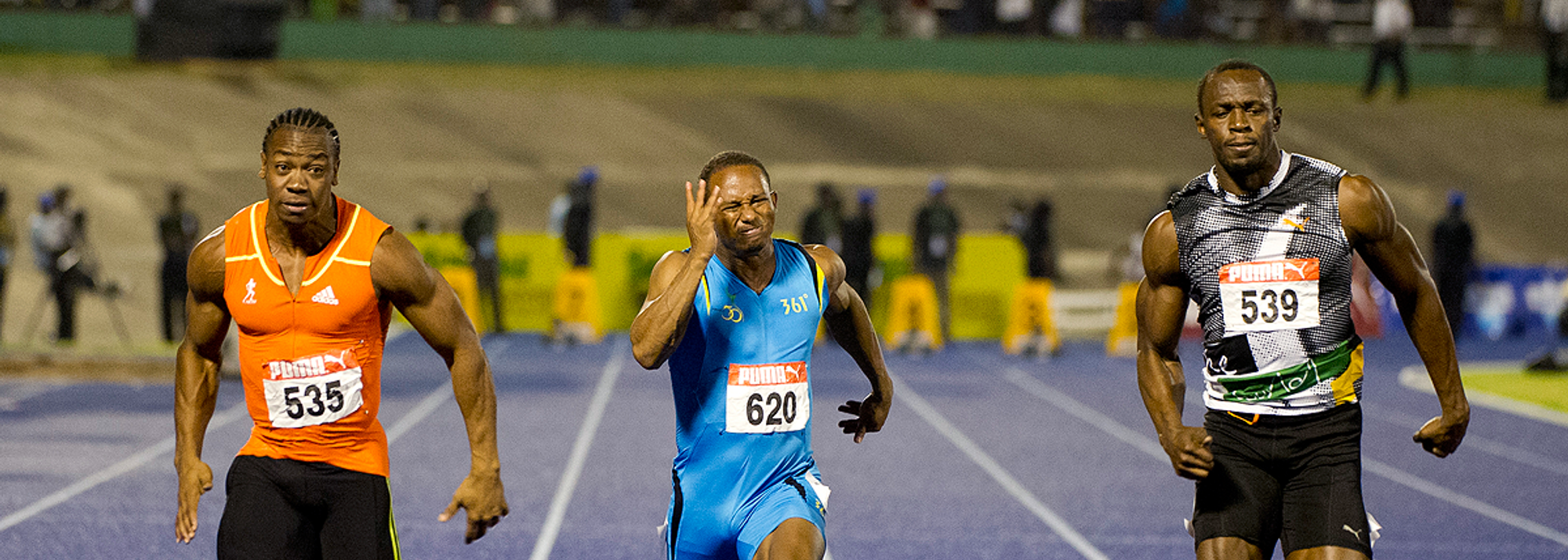 Yohan Blake (l) upsets Usain Bolt in the 100m at the Jamaican Championships in Kingston (© AFP / Getty Images)