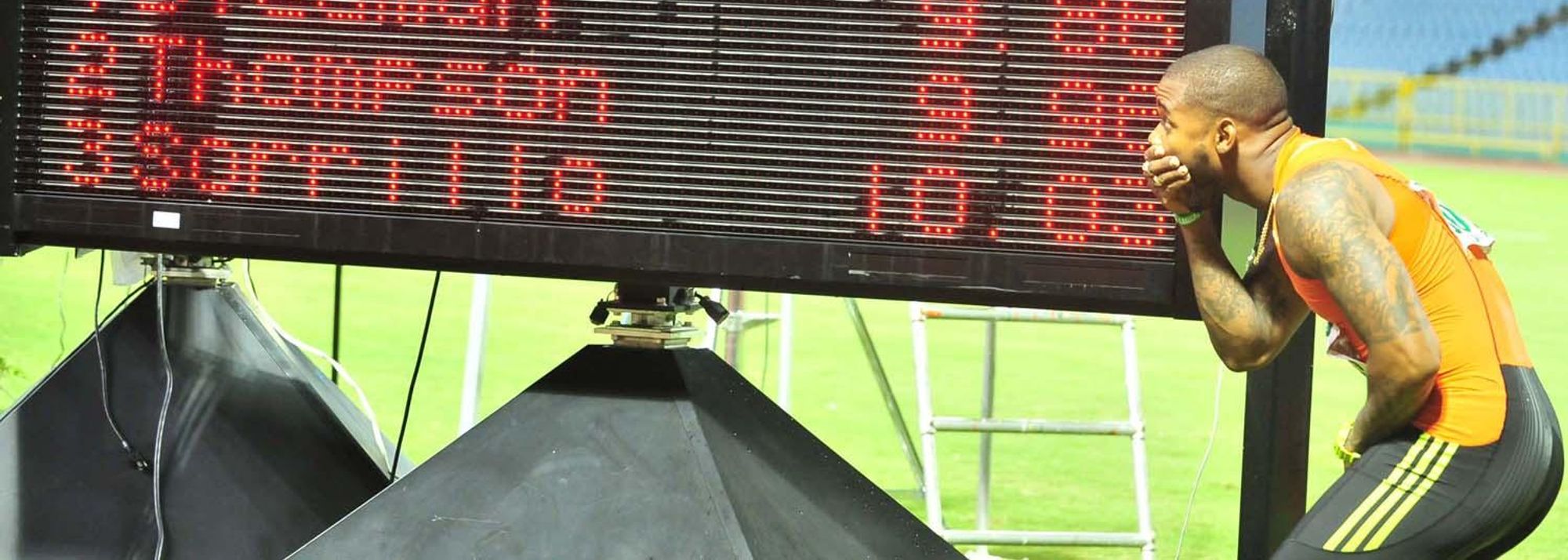 Keston Bledman stands in awe of his 9.86 seconds clocking in the 2012 National Championship men's 100 metres final, in Port of Spain (© Robert Taylor/Trinidad Express)