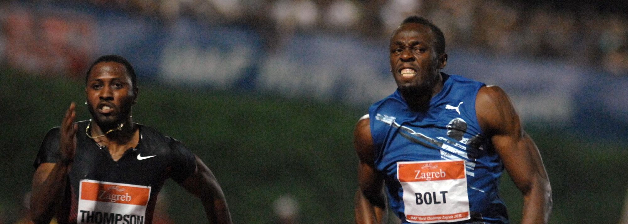 Usain Bolt (r) stride-for-stride with Richard Thompson in Zagreb (© Zagreb organisers)