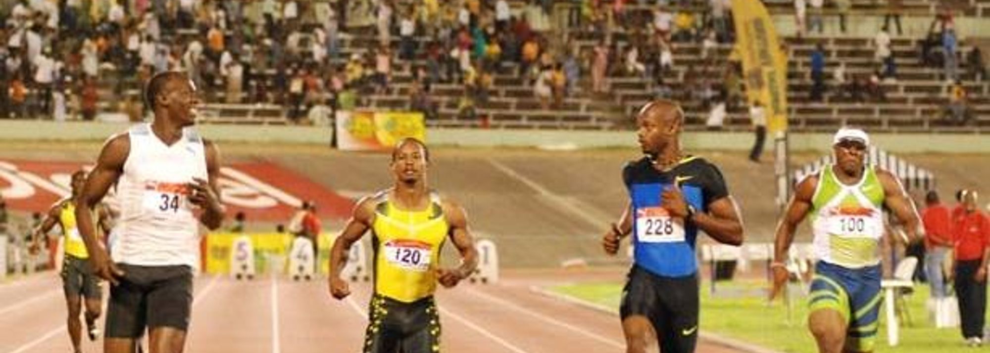 Usain Bolt (left) cruises across the finish line to win the men's 100m dash at Saturday's Jamaica's Olympic Trials. Asafa Powell (second right) was second ahead of Michael Frater (© Sporting Eagle)