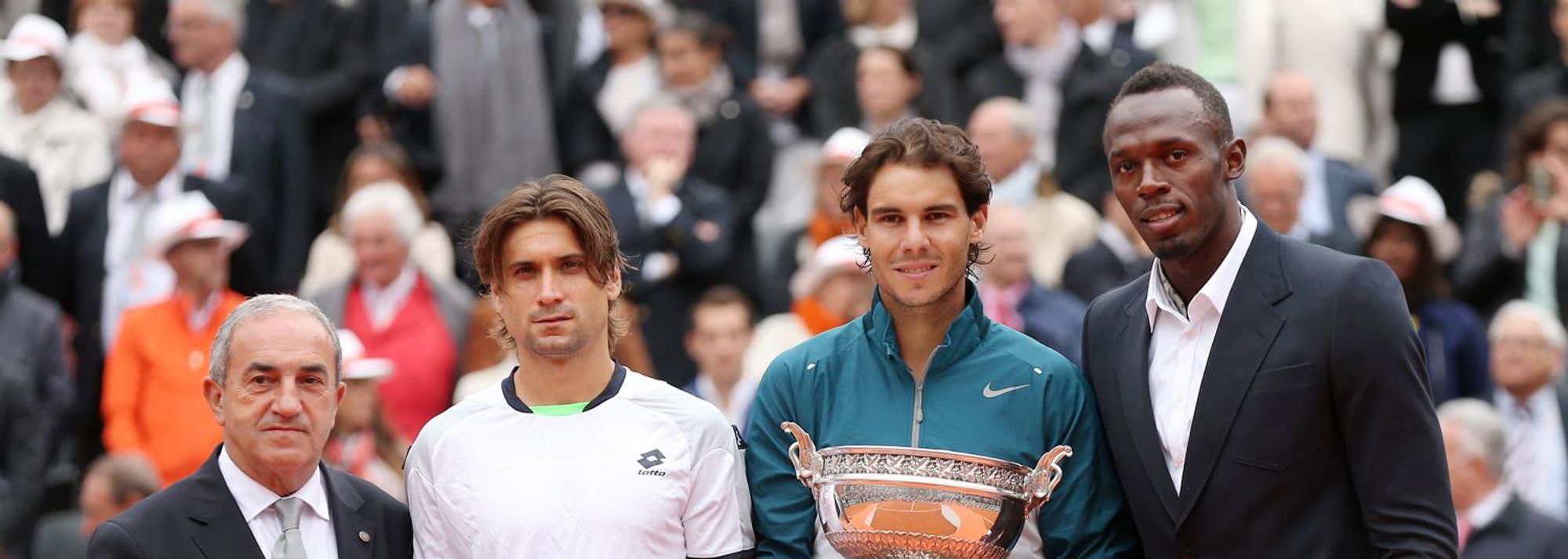Usain Bolt presents Rafael Nadal with his trophy at the 2013 French Open (© Getty Images)