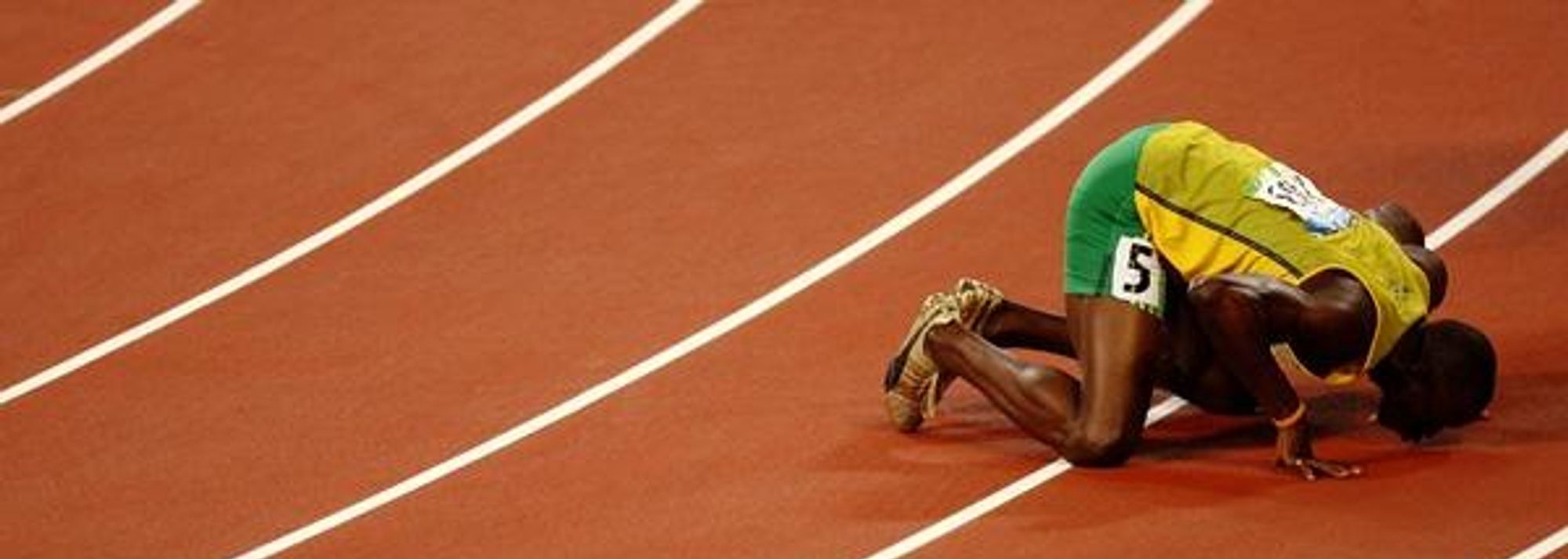 Usain Bolt kisses the track in Beijing upon which he set two individual sprint World records (100m and 200m) and one team (4x100m) (© Getty Images)