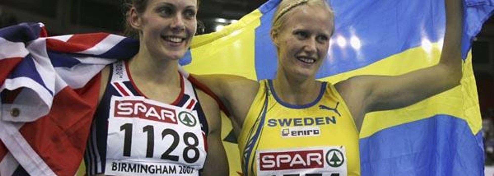 Carolina Kluft (r) and Kelly Sotherton celebrate their Pentathlon 1-2 in Birmingham (© Getty Images)