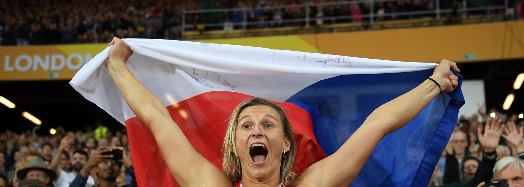 Barbora Spotakova celebrating her world title in London (© Getty Images)